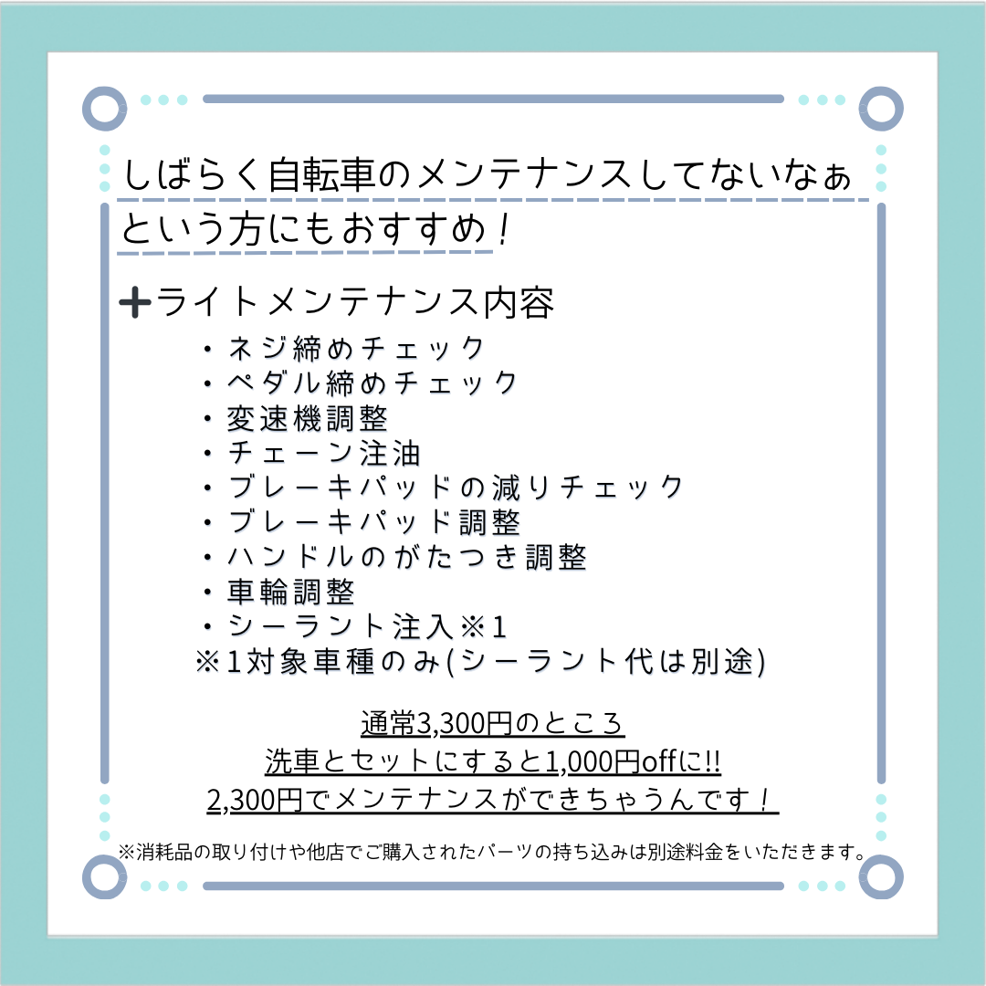 大切な自転車を大切に乗りたい方や、久しぶりに乗る方にぜひお勧めしたいサービスです♡
